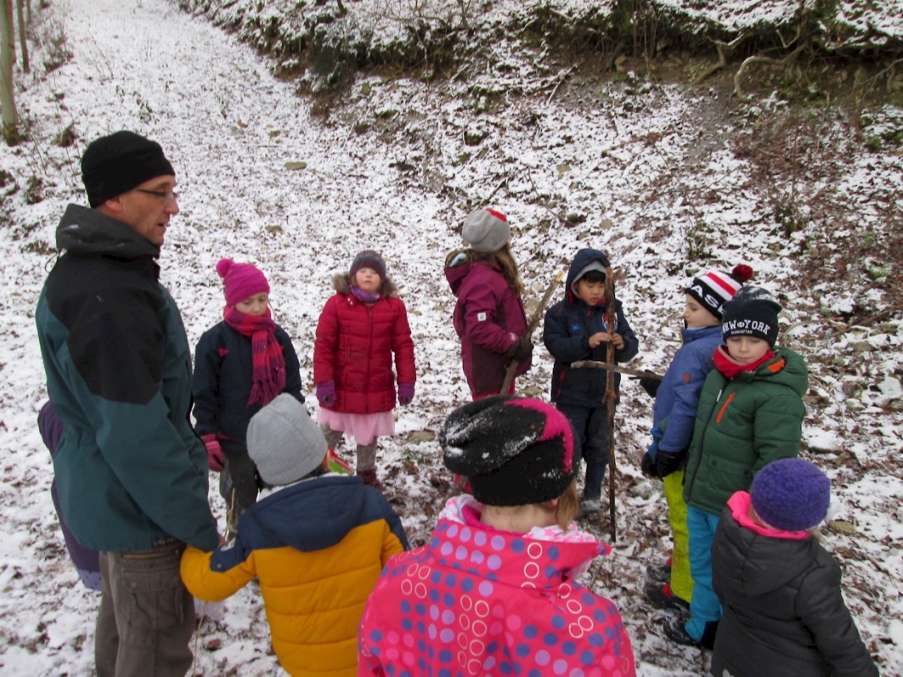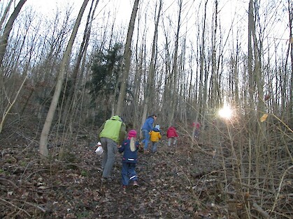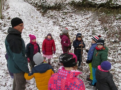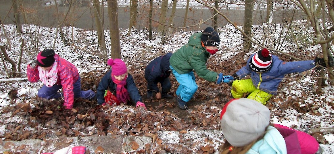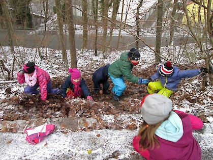 Es gibt viel zu entdecken beispielsweise Spuren im Schnee, verschiedene Blätter, klitzekleine Tierchen unter Steinen und Laub und vieles mehr. Außerdem können wir das Rascheln des Laubes hören, wenn man hindurchläuft oder das Konzert der Vögel, die schon für den Frühling üben. Besonderen Spaß bereitete es uns einen Unterstand aus Ästen und Moos zu bauen. Leider geht die Zeit immer viel zu schnell rum. Aber zum Glück ist ja bald schon wieder Montag!