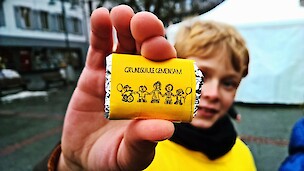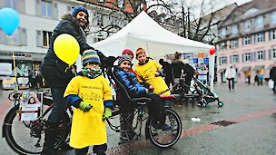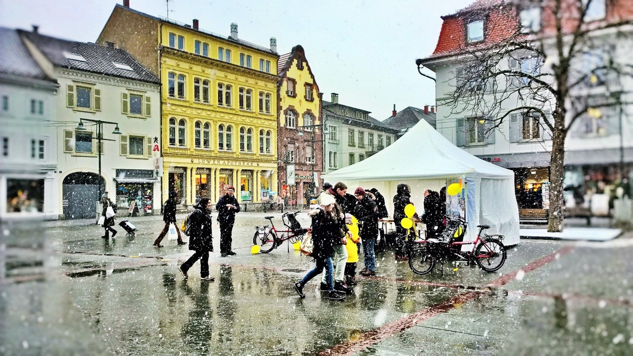 Wer am Samstag im Schneegestöber in Lörrachs Fußgängerzone unterwegs war, konnte die leuchtenden Gasluftballons, die Schüler im gelben Shirt und die besonderen Hase-Bikes nicht übersehen und wurde sicher von rotwangigen, begeisternden Schülern mit einer selbstgemachten Schokolade und einem Flyer für den nächsten Infoabend beschenkt.