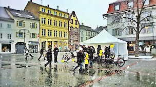 Eltern, Lehrer und Schüler trotzten dem kalten Wetter und warben mit einer Infowand und einem Kuchenverkaufsstand auf dem Marktplatz für Ihre Schule. Auch wenn auf der Fahrt mit dem besonderen Tandem so mancher Flyer etwas nass wurde, nahmen die Passanten sie dankbar aus den kalten Kinderhänden.