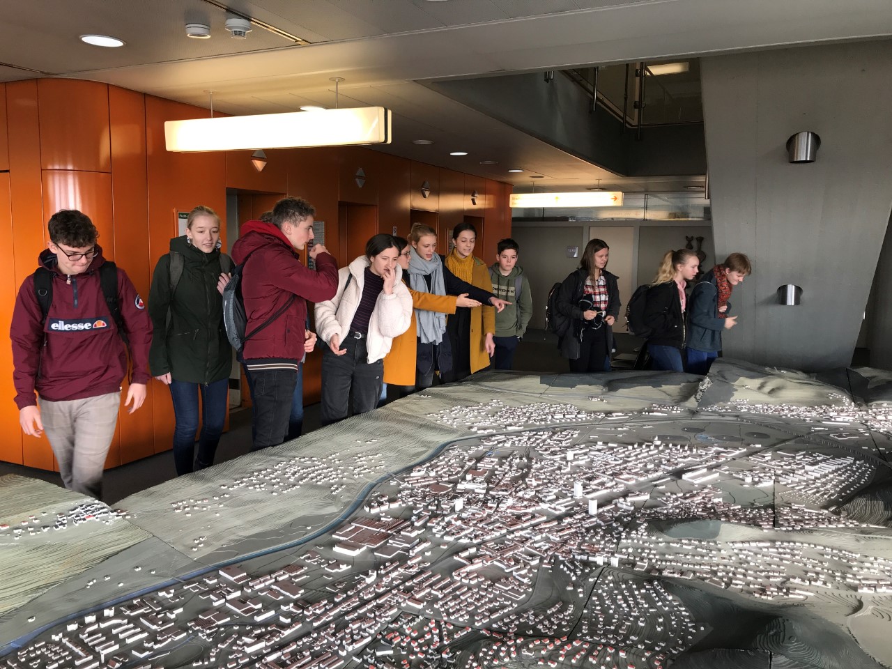 Anschließend sind wir mit dem Lift in den dreizehnten Stock gefahren und haben ein Modell von Lörrach angeschaut, auf dem wir auch die FES finden konnten.