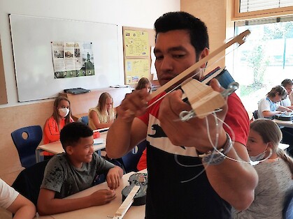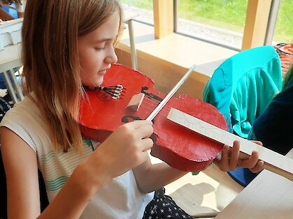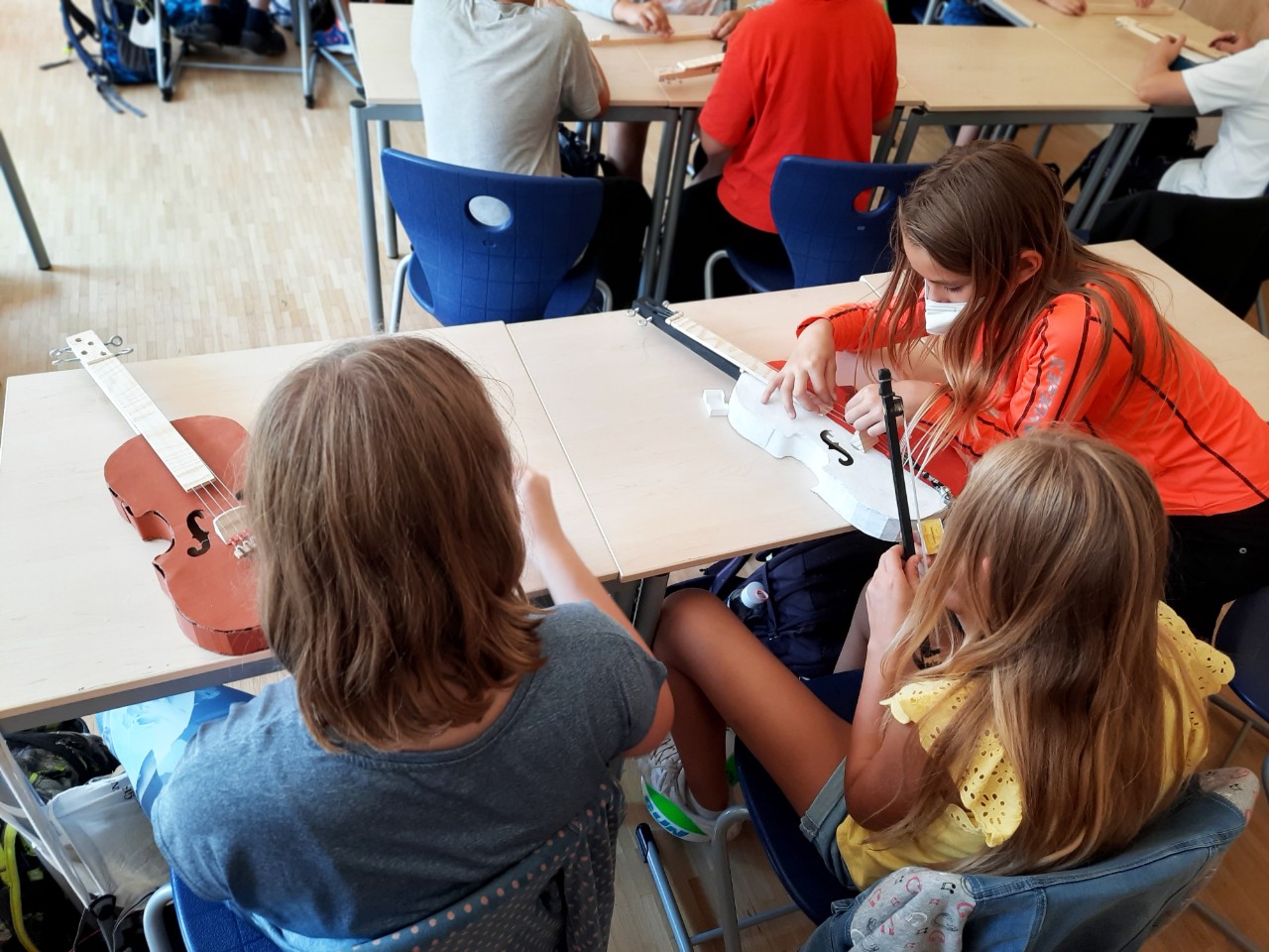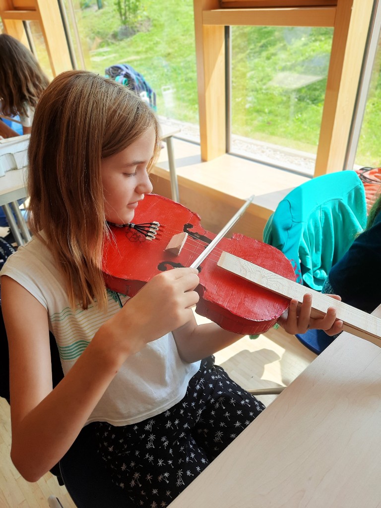 „Mehr Kolophonium! Ihr braucht mehr Kolophonium“, ruft Herr Garcia in die Klasse. „Wenn ihr das Harz 100-mal über den Bogen gestrichen habt, müsst ihr nochmal von vorn anfangen.“ Ein geschäftiges Treiben, aufgeregtes Gemurmel und Geräusche, die tatsächlich an echte Geigentöne erinnern, brechen los. Die Schülerinnen und Schüler der R5c arbeiten eifrig an ihren bunten Geigenkörpern aus Pappe und Holz, streichen viiiiel Bogenharz, wie das Kolophonium auch genannt wird, auf den ebenfalls selbstgebauten Bogen. „Damit kann eine bessere Reibung erzeugt werden“, erklärt mir ein Schüler. „Das Harz wird aus Bäumen gewonnen, klebt auch ein bisschen. Man darf es aber nicht auf die Saiten streichen, nur auf die Bogenhaare.“