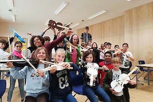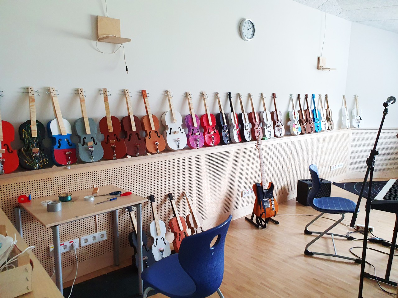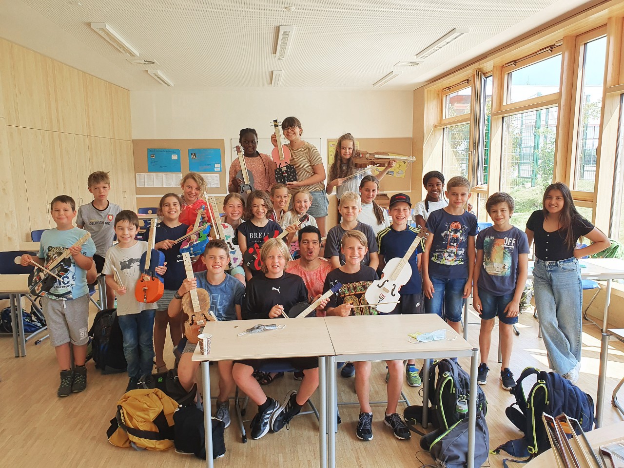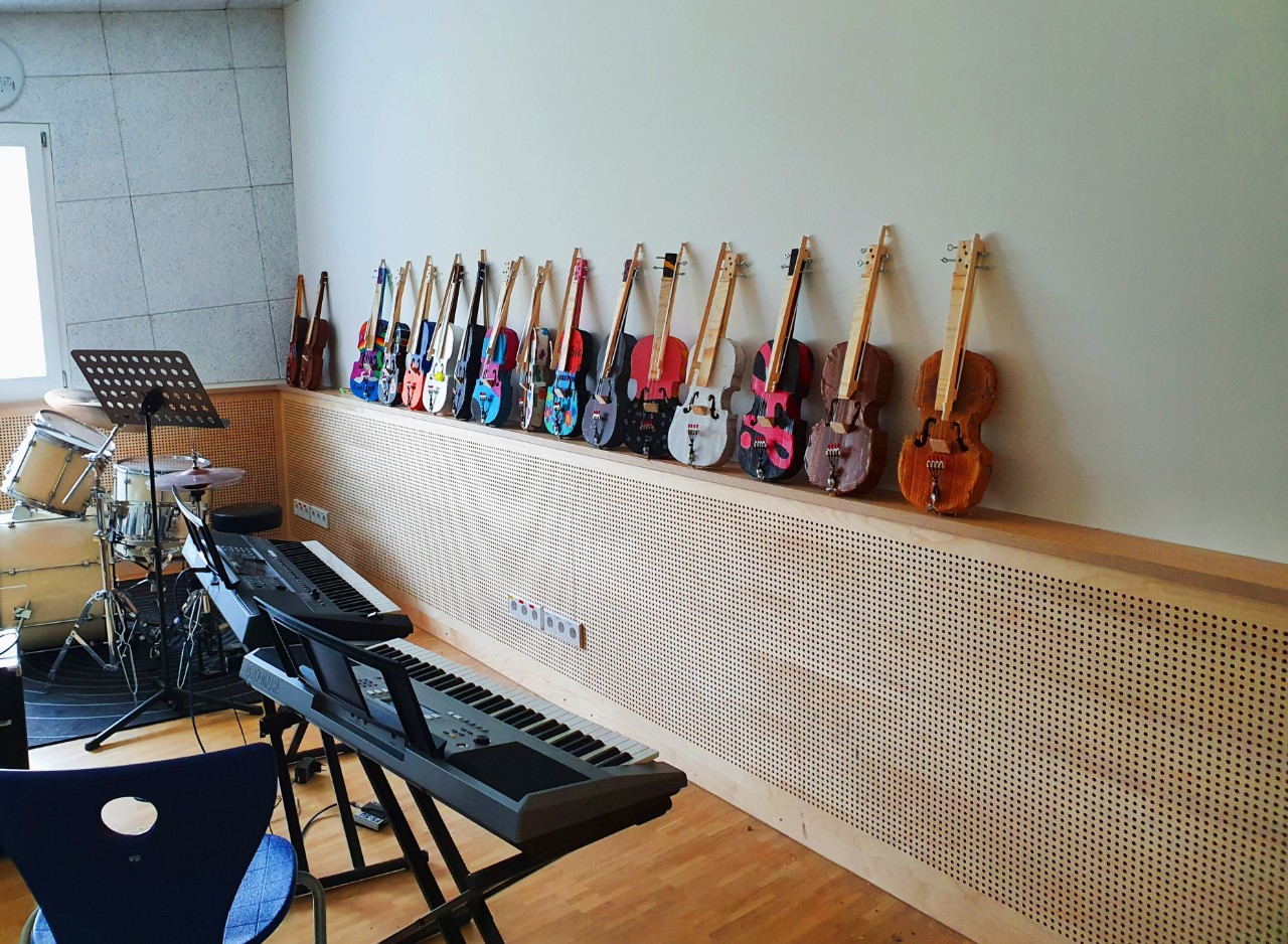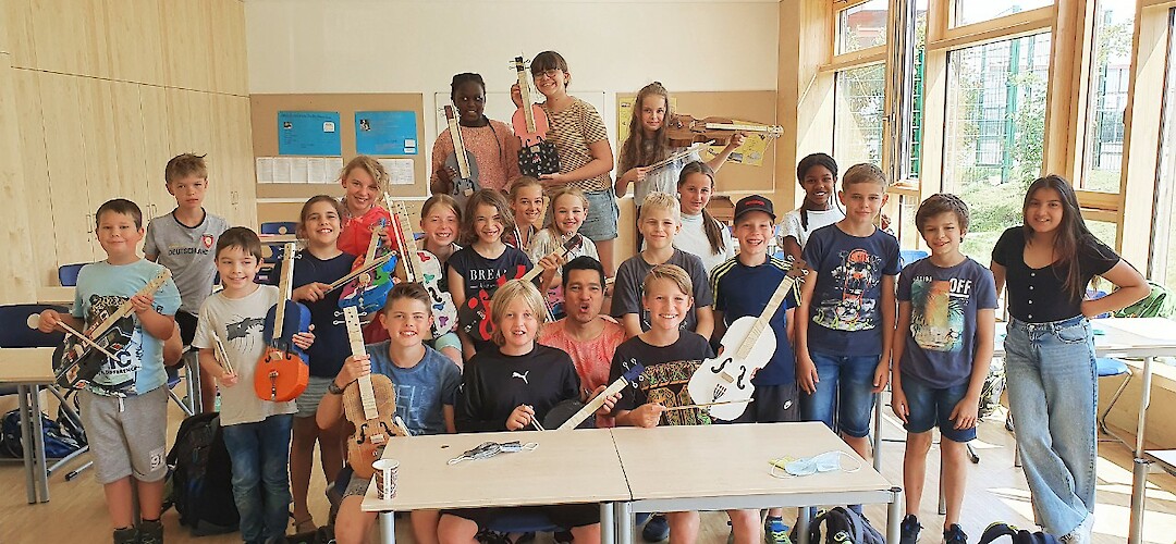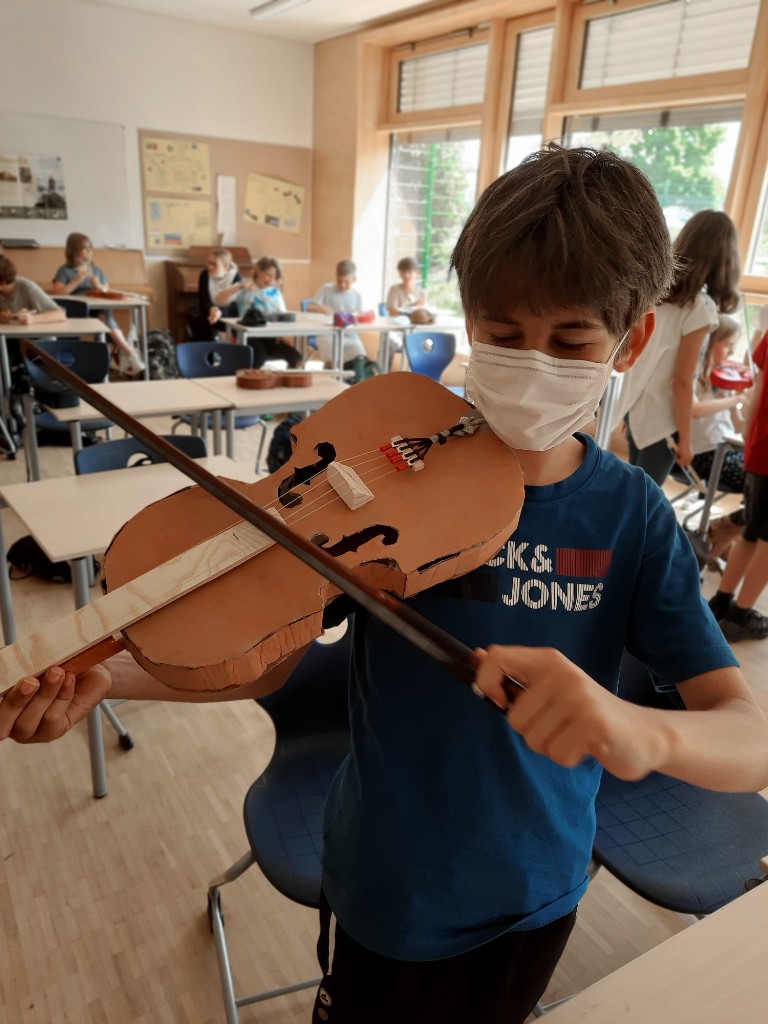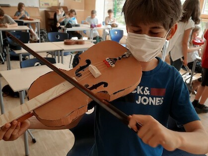 Bereits vor dem letzten Lockdown hat Musiklehrer Gaspar Garcia mit den fünften Klassen der Realschule begonnen, eigene Geigen aus Recyclingmaterial zu bauen. Jede sieht anders aus. Bunt sind sie. Und klingen schon richtig gut. So wird Schule greifbar und vielleicht hat nun der eine oder die andere Lust, ein (neues) Instrument zu lernen.