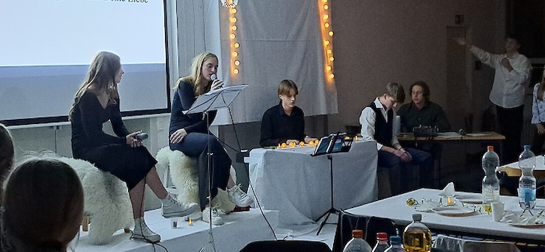 Satt von der Pizza ging starteten die Gäste in einen fröhlichen, abwechslungsreichen Abend mit Lobpreis, kurzer Einleitung von Nina Ricca und einem lustigen Video, das die zwei fröhlichen Sprecherinnen Rebecca Gayer und Lillian Ricca in den vergangenen Tagen auf dem Schulhof gefilmt haben. Die Hauptfrage war: „Findest du Weihnachten nötig?“ oder auch „Warum feiern wir eigentlich Weihnachten?“