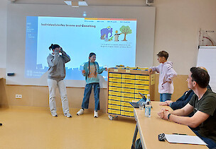 Im weiteren Verlauf stellte Frau Aberle sämtliche Bausteine der Berufsorientierung als langen, immer breiter werdenden Weg hin zum Schulabschluss vor. Dazu gehören neben den vielfältigen Berufspraktika auch Elemente, die der Charakterbildung dienen wie das Coaching, Teambuilding-Events oder der Knigge-Abend. Drei Schülerinnen und Schüler der 8. Klasse stellten einen wichtigen Baustein auf besondere Weise vor. Mit einem Theater-Anspiel erklärten sie den Anwesenden, was es eigentlich mit dem "IL" – dem individualisierten Lernen – und dem Coaching auf sich hat. In Klasse 5 und 6 haben die SchülerInnen in den Fächern Deutsch, Mathe und Englisch die Möglichkeit, schneller oder langsamer weiterzukommen – jeder so, wie es für ihn richtig ist. In regelmäßigen 1:1-Gesprächen werten sie gemeinsam mit ihrem Klassenlehrer aus, wo sie stehen und was sie erreichen möchten.
