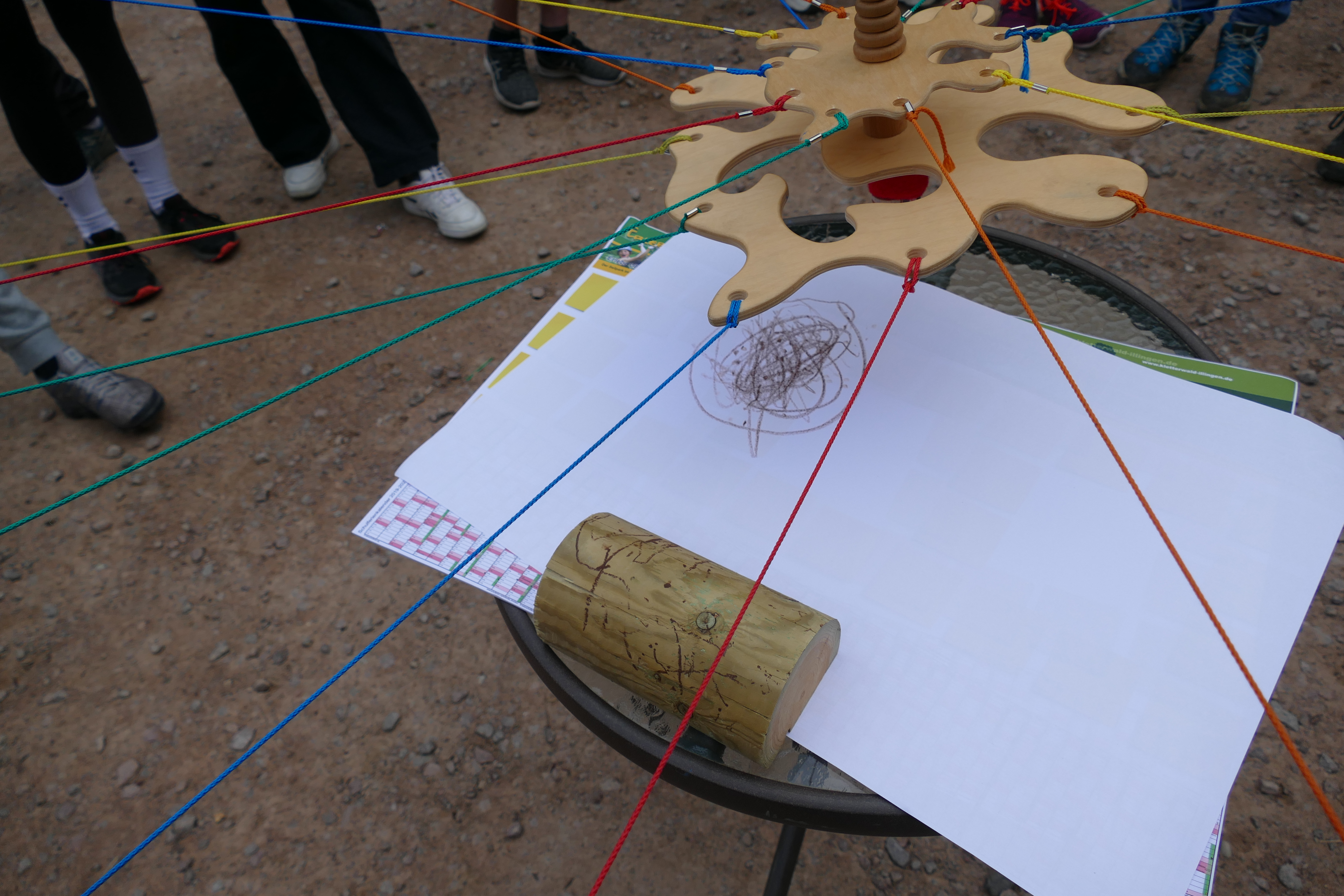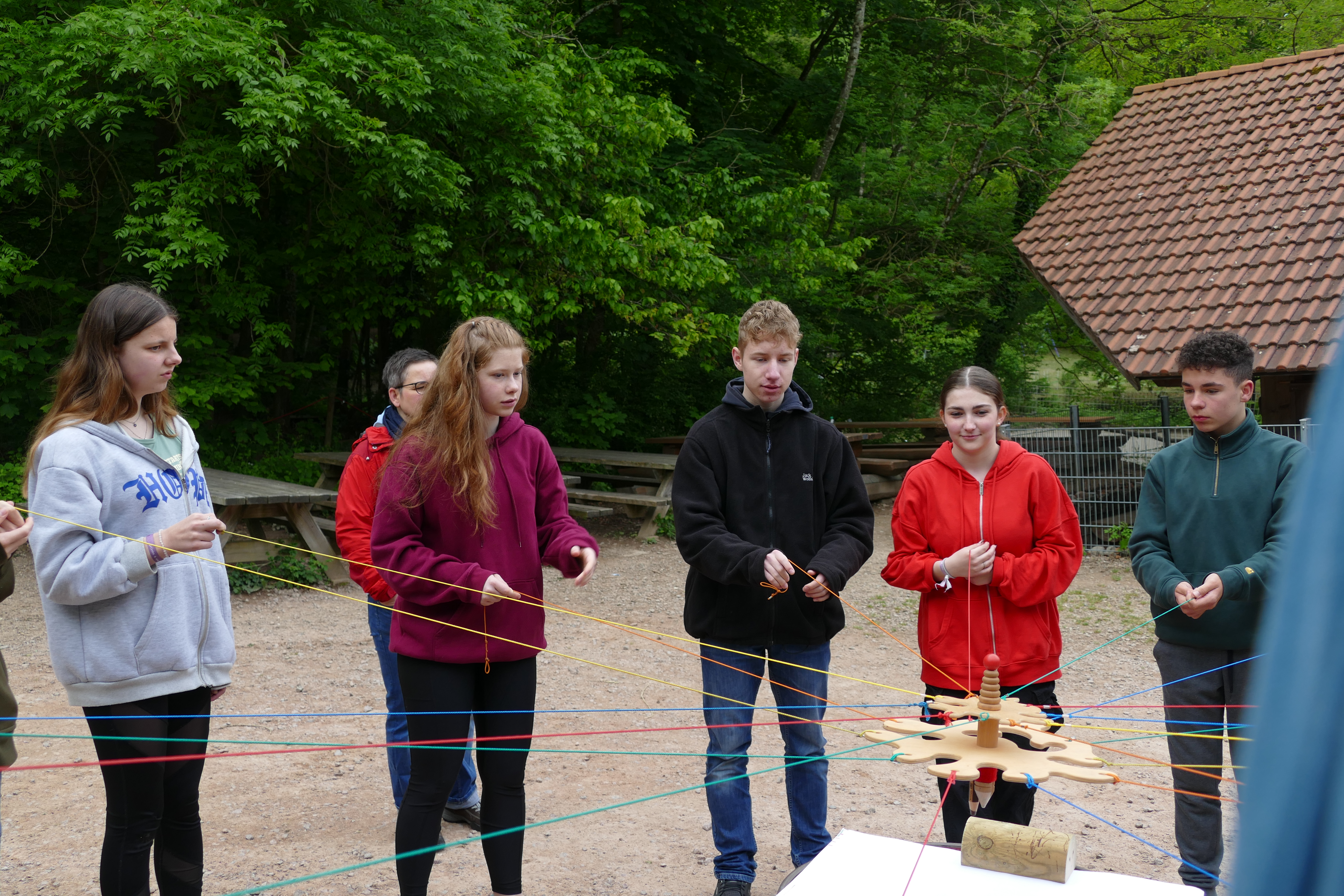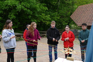 Zu Beginn stärkten wir unsere Klassengemeinschaft, durch ein erlebnispädagogisches Spiel. Die Aufgabe war, dass wir gemeinsam auf ein Blatt Papier mit einem Stift, welcher an 20 Fäden befestigt war ein Gegenstand zeichnen, denn sich die restlichen 5 SchülerInnen ausgedacht haben. Unsere Klassenlehrerinnen hatten die Aufgabe zu erraten, was für einen Gegenstand wir gezeichnet haben.